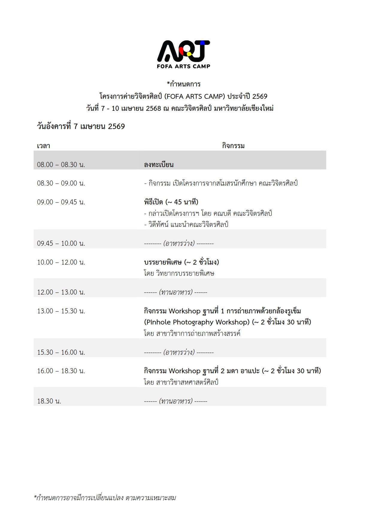 กำหนดการ ค่ายวิจิตรศิลป์ (FOFA ARTS CAMP)