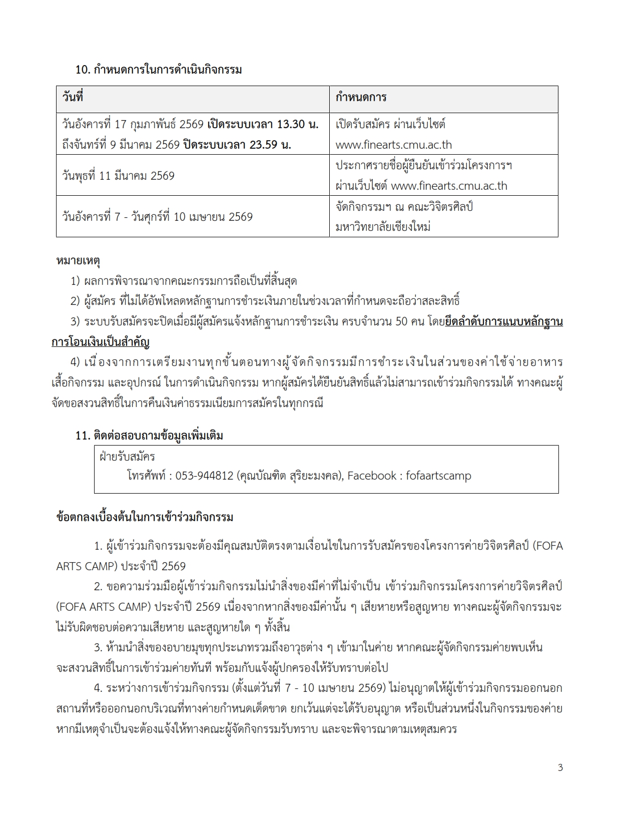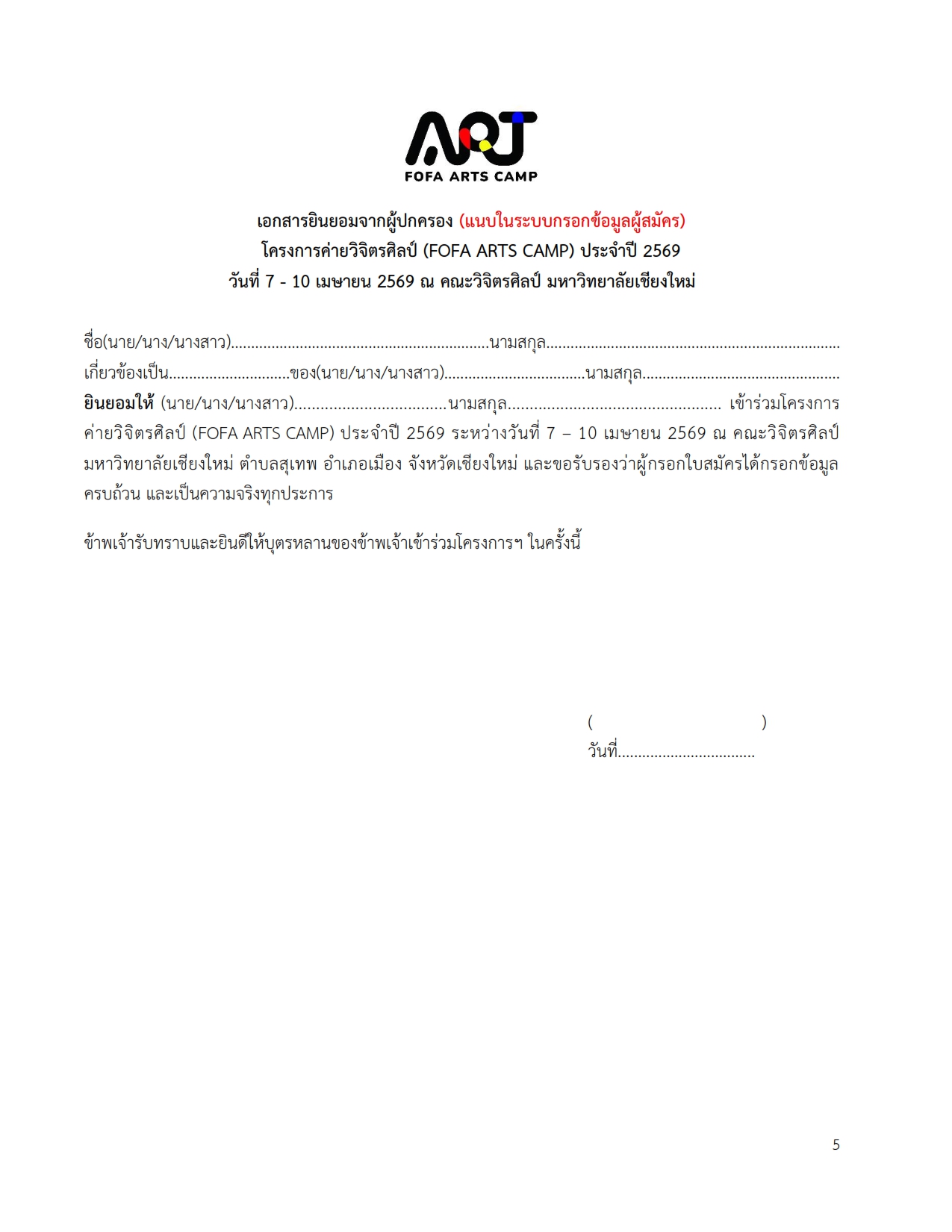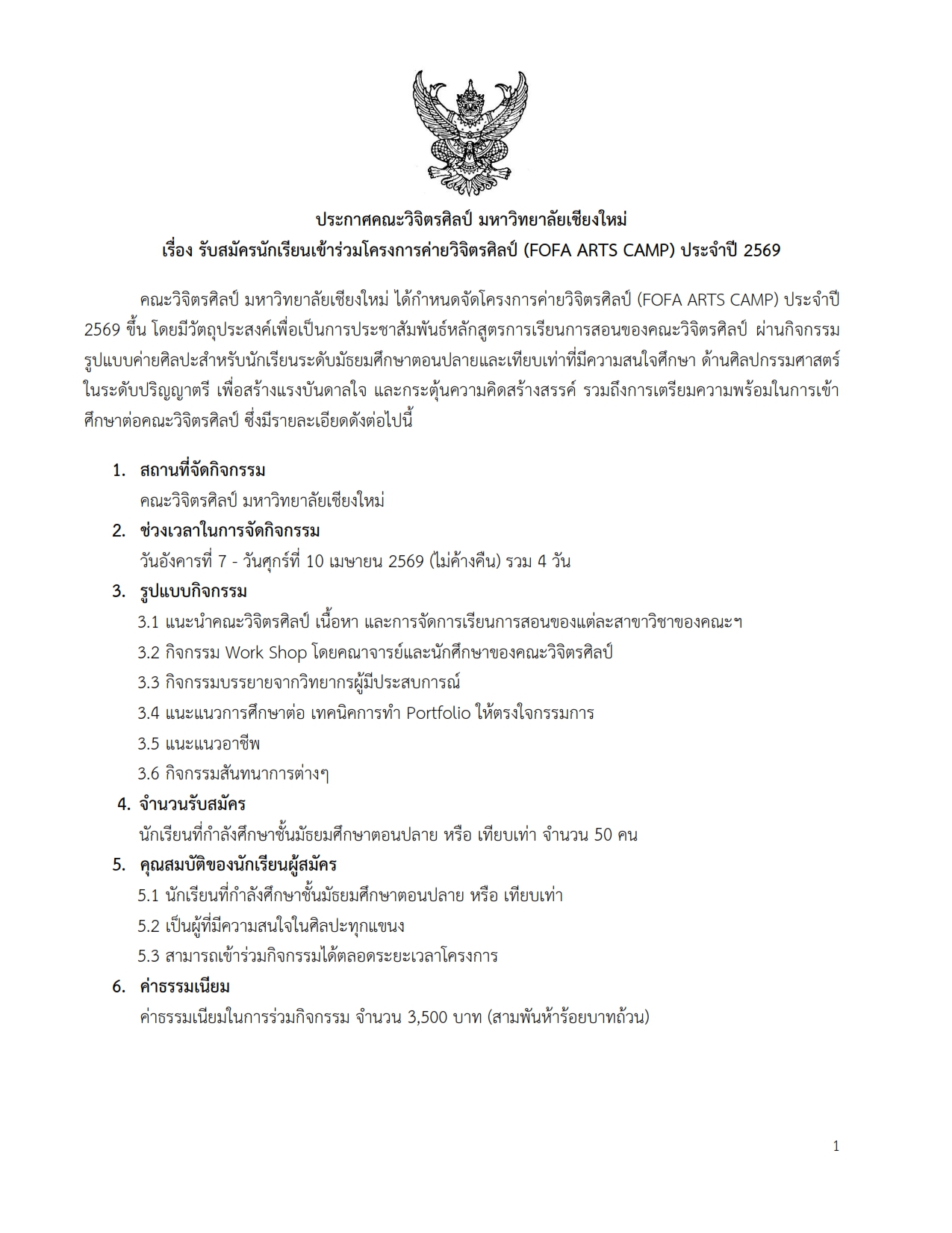 คณะวิจิตรศิลป์ มหาวิทยาลัยเชียงใหม่ ได้กําหนดจัดโครงการค่ายวิจิตรศิลป์ (FOFA ARTS CAMP) ประจําปี 2569 รายละเอียดต่อไปนี้